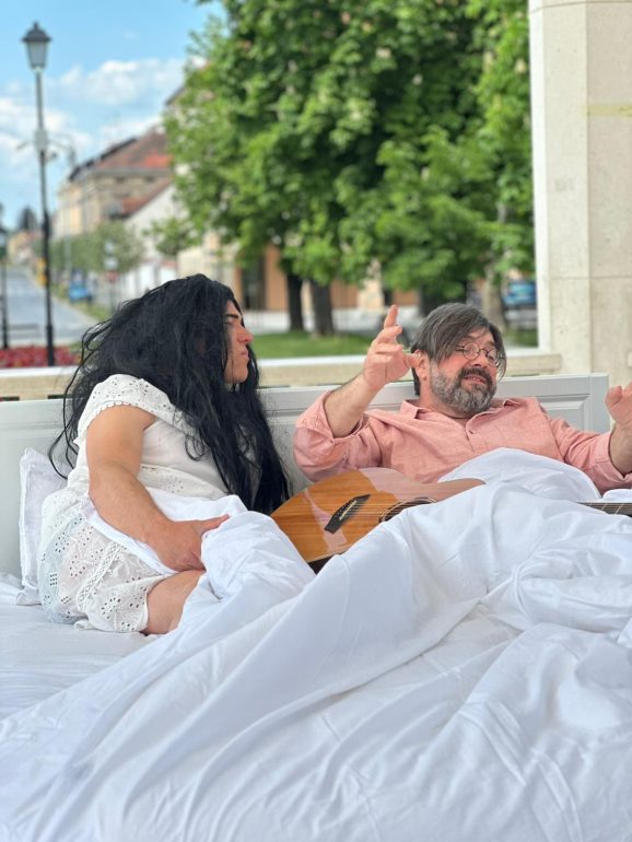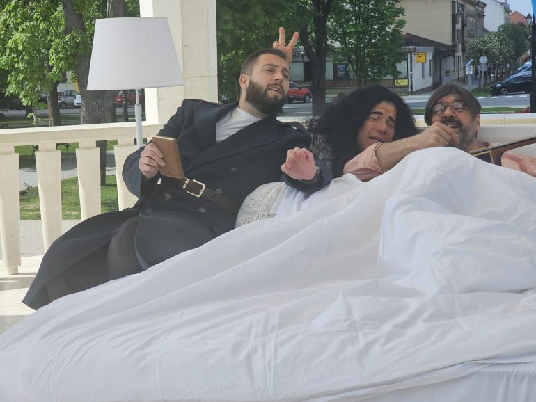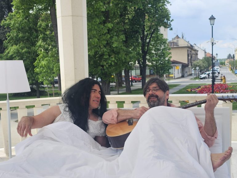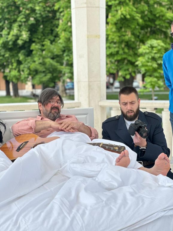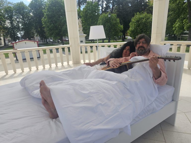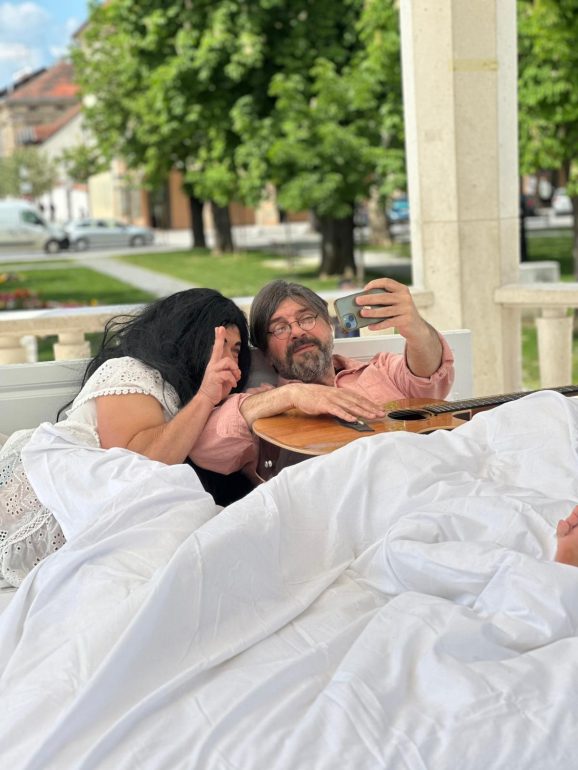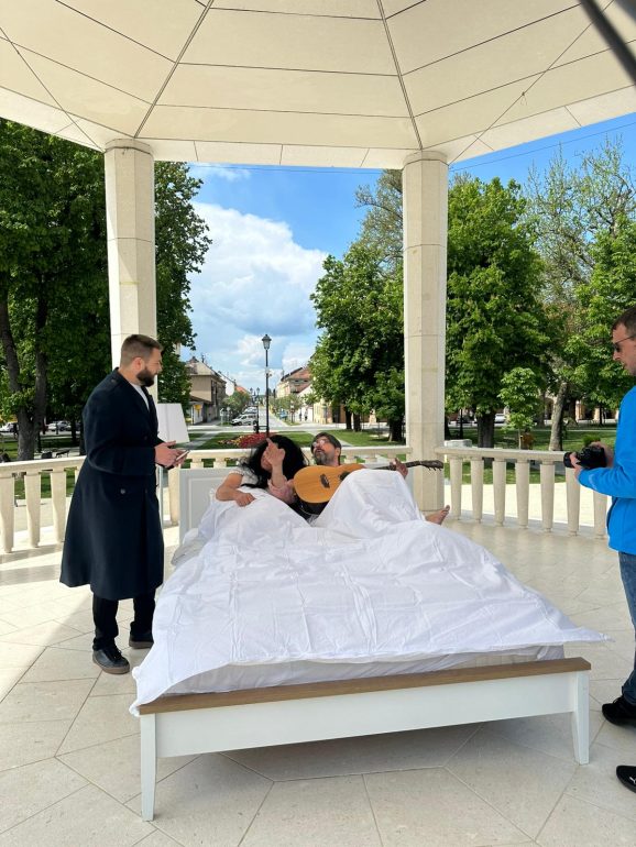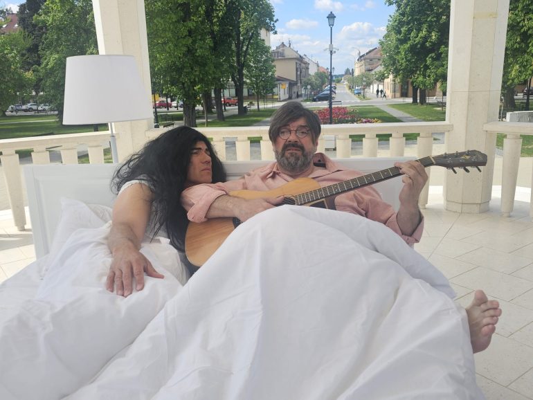 Danas smo u središnjem bjelovarskom gradskom parku snimali nešto što je, u najmanju ruku, privuklo pažnju prolaznika. U samom paviljonu, u krevetu, “uhvatili” smo Marija Petrekovića i Gorana Navojca, dok su se parkom širili dobro poznati stihovi pjesme Give Peace A Chance. Kamere i snimateljska oprema prizoru je dala cijeli kontekst – riječ je o snimanju najavnog spota za četvrto izdanje našeg koncerta BOK Alfa Jukebox.